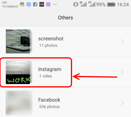 ຊຶ່ງທ່ານສາມາດເບິ່ງວິດີໂອ ຫຼື ພາບທີ່ເຄີຍແຊຣ໌ຂື້ນ Instagram Stories ໄດ້ທາງແອັບຯ Gallery ເລືອກທີ່ອາລະບັ້ມ Instagram ຫາກບໍ່ແມ່ນ ສາມາດລົບໄຟລ໌ ວິດີໂອທີ່ໂຟລ໌ເດີດັ່ງກ່າວເພື່ອເພີ່ມພື້ນທີ່ວ່າງໃຫ້ກັບ ໂທລະສັບຂອງທ່ານ